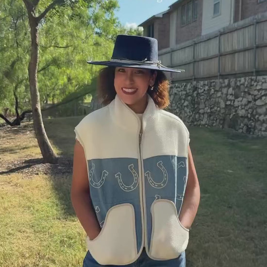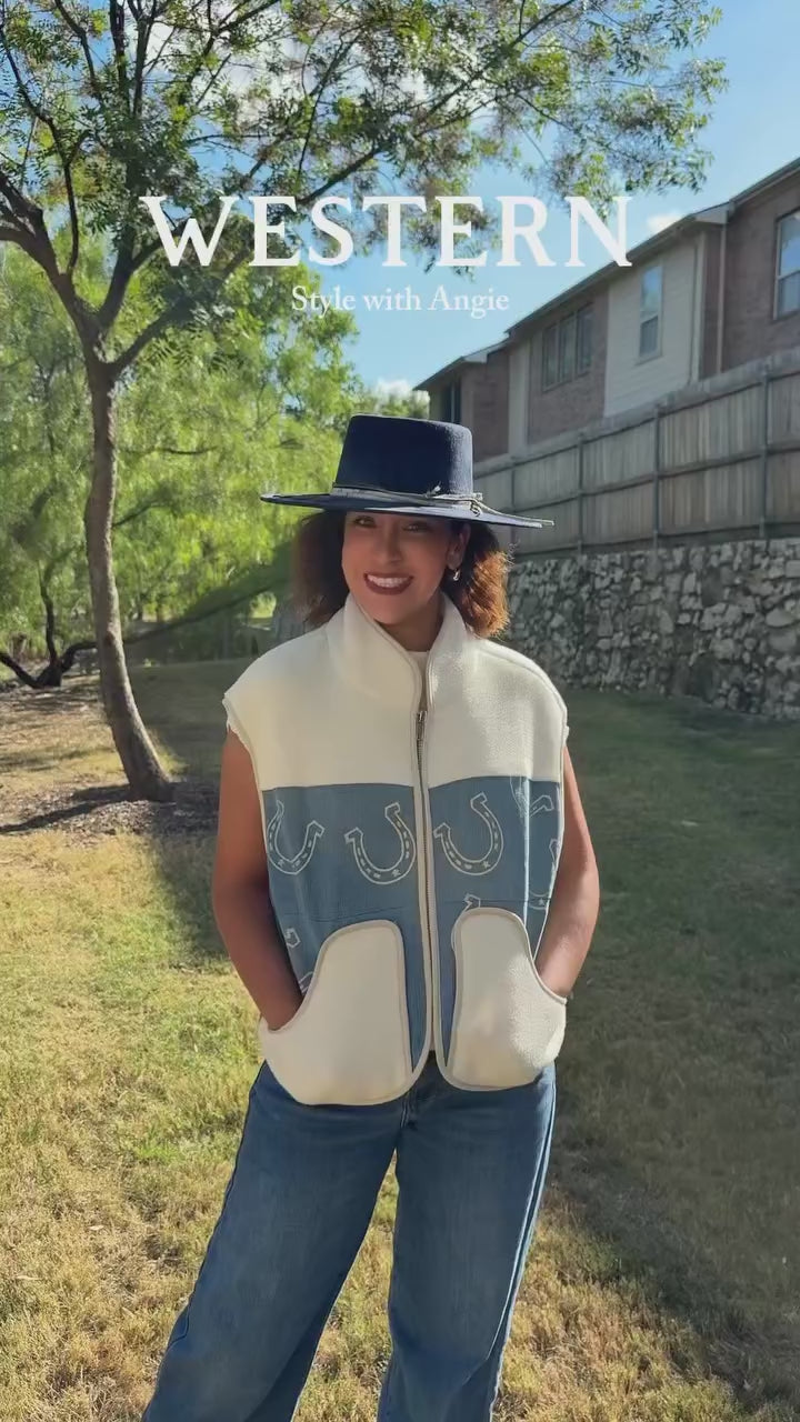 * Western warmth with a touch of denim. This cozy sherpa vest features denim panels with a lucky horseshoe print and a full zip closure.