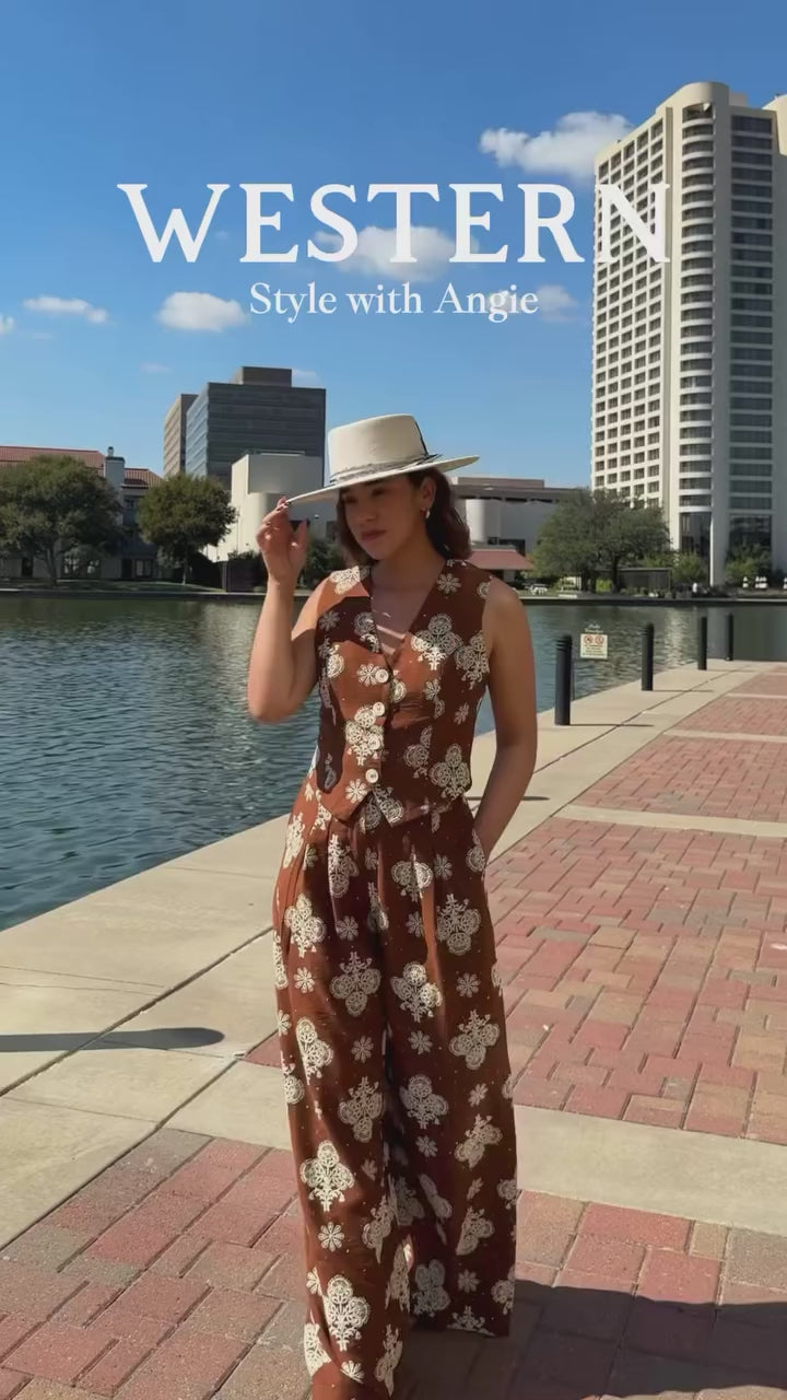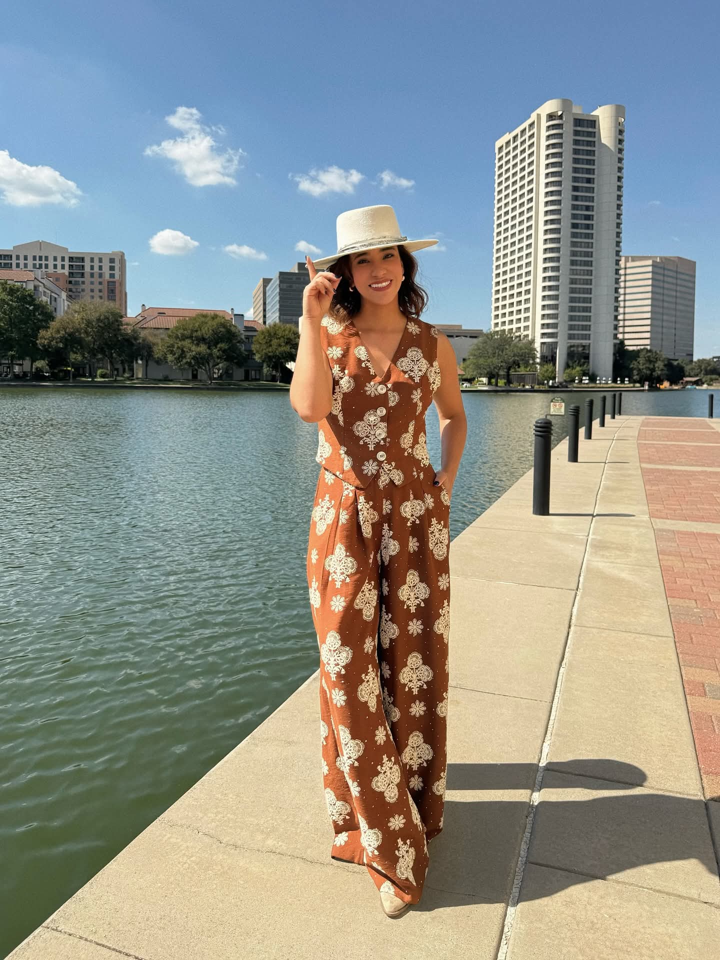 * This head turning 2 piece set featuring a tailored vest and high waist pleated wide leg trousers is all about bold and confidence. Delicate lace appliques trace the edges of both pieces.